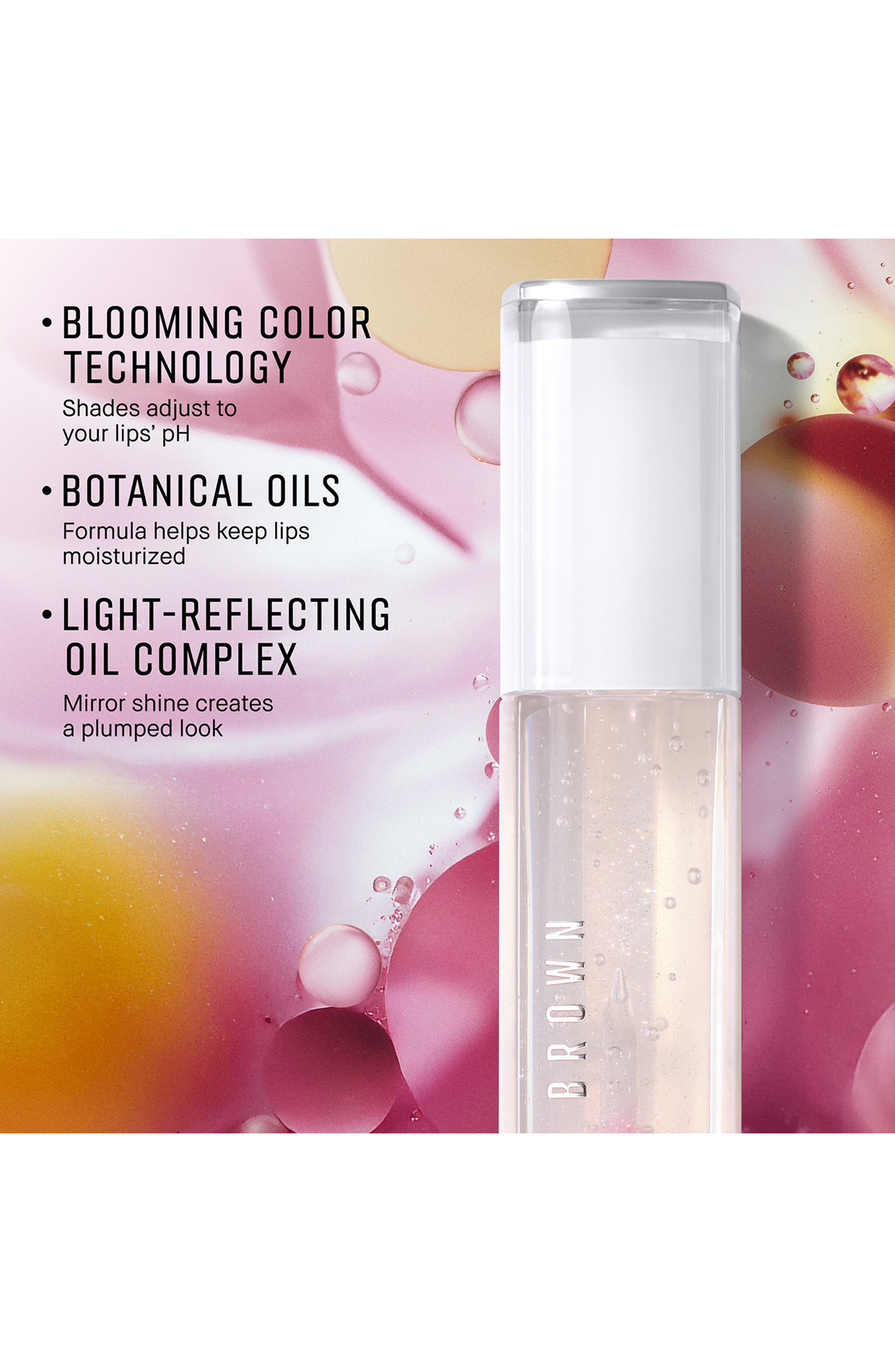 A plush, tinted lip oil that wraps lips in nourishing moisture and adjusts to lips pH for a healthy-looking flush of custom color with a high-shine mirror finish. It instantly refreshes lips with a subtle cooling sensation.